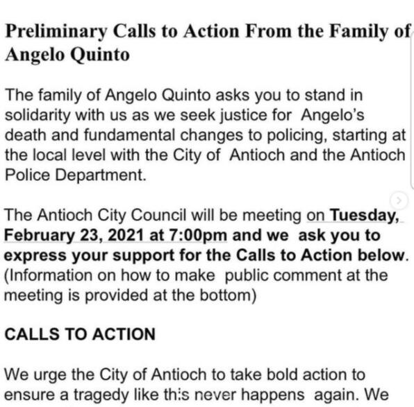 The following photos are reposted from @tfalpodcast on Instagram, who reposted from @hello.im.kirin on Instagram.The following are the preliminary calls to action from the family of Angelo Quinto. In this call to action, the family is asking you to show up and speak out at the Antioch Town Hall today, Tuesday February 23, 2021 at 7pm PST.